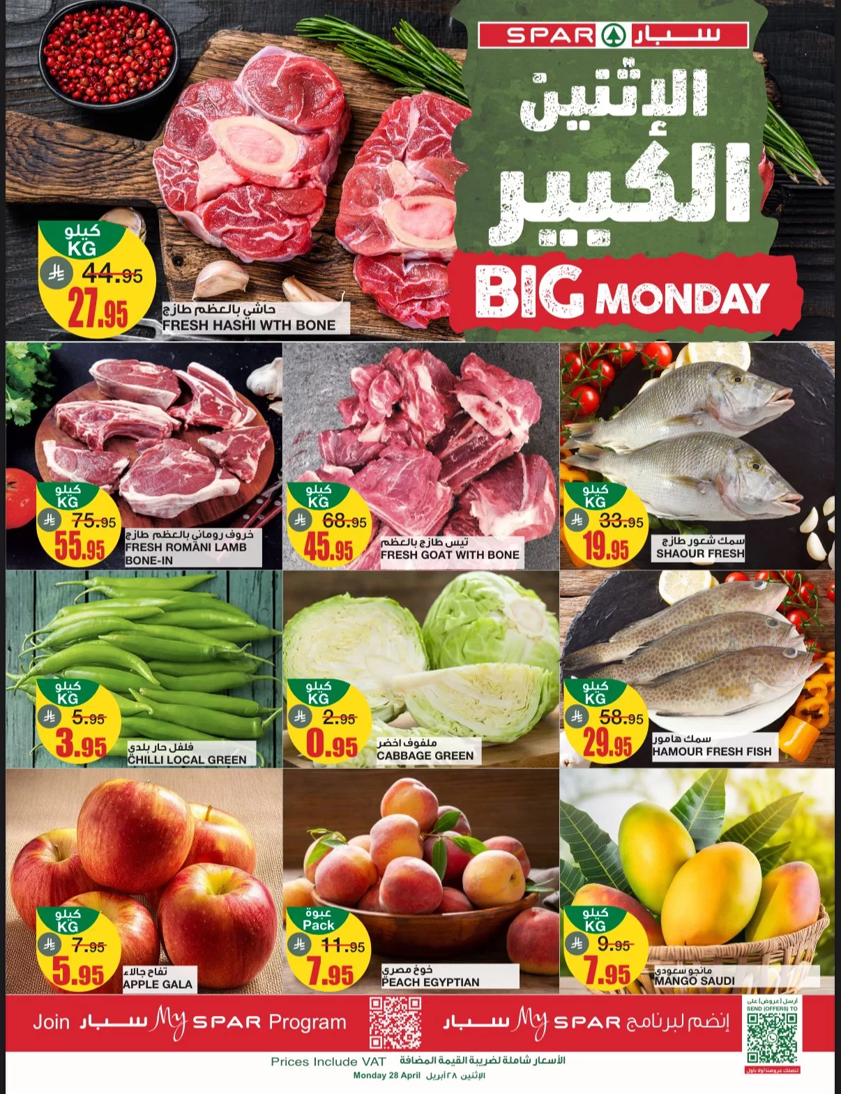 عروض سبار السعودية الاثنين 28/4/2025 تقدم لمحبي التسوق مجموعة مميزة من المنتجات الغذائية الطازجة والمستوردة حيث تشمل العروض لحوم طازجة مثل لحم الغنم الروماني ولحم التيس الطازج بالإضافة إلى تشكيلات متنوعة من الأسماك الطازجة مثل سمك الهامور والشعور والخضروات المحلية الطازجة