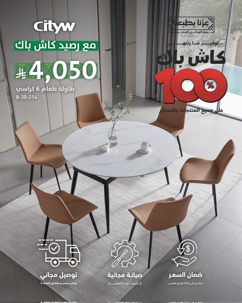 تقدم سيتي دبليو CityW عرض مميز بمناسبة اليوم الوطني السعودي حيث يجمع بين الأناقة العصرية والعملية مع أسعار منافسة وعروض كاش باك استثنائية. العرض على طاولة طعام مع 6 كراسي بسعر 4,050 ريال لا تفوتوا التوفير