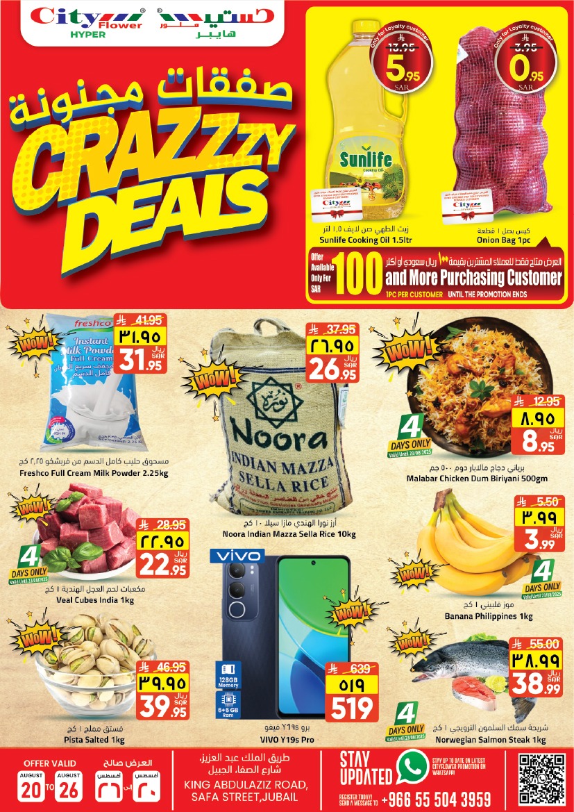 عروض سيتي فلور الجبيل الأسبوعية الأربعاء 26 صفر 1447هـ تقدم منتجات غذائية تشمل التمور الفاخرة المحشوة بالمكسرات والمعلبات والفواكه الطازجة بجانب الأجبان مثل الجبن الشيدر والجبن الكريمي بالإضافة إلى الأجهزة المنزلية التي تضم أجهزة تحضير العصائر وصانعات الكريب وأجهزة صنع القهوة باقل الاسعار