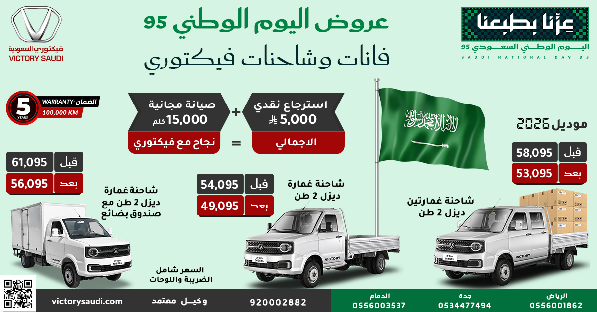 عروض شاحنات فيكتوري تقدم افضل الاسعار المنافسة احتفالا في اليوم الوطني 95 على السيارات و الشاحنات المتينة والعملية مع أسعار مغرية وخدمات ما بعدها خدمات لا تفوتوا هذه العروض الحصرية و استفيدوا من التخفيضات