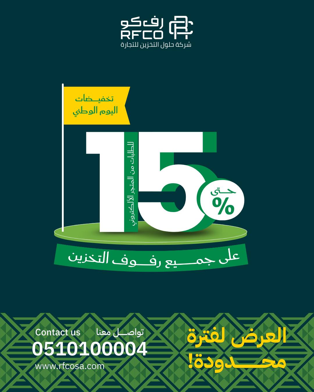 تخفيضات شركة رفكو لحلول التخزين التي أعلنت عن خصومات مميزة تصل حتى 15% على جميع منتجات رفوف التخزين والتنظيم. ويأتي هذا العرض كفرصة مثالية للأفراد والشركات الراغبين في تنظيم مساحاتهم بطريقة عملية وذكية هذه العروض الخاصة بمناسبة اليوم الوطني السعودي 95 لا تفوتوا عروض التوفير