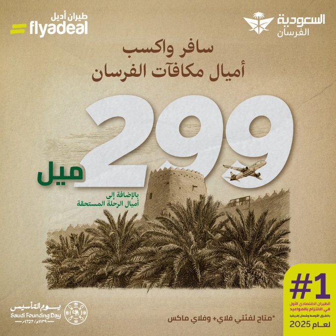 عروض طيران اديل الاحد 8 فبراير 2026 الموافق 20 شعبان 1447هـ و بمناسبة يوم التاسيس بتقدم اقوي العروض تحت شعار سافر و اكسب اميال و مكافات الفرسان