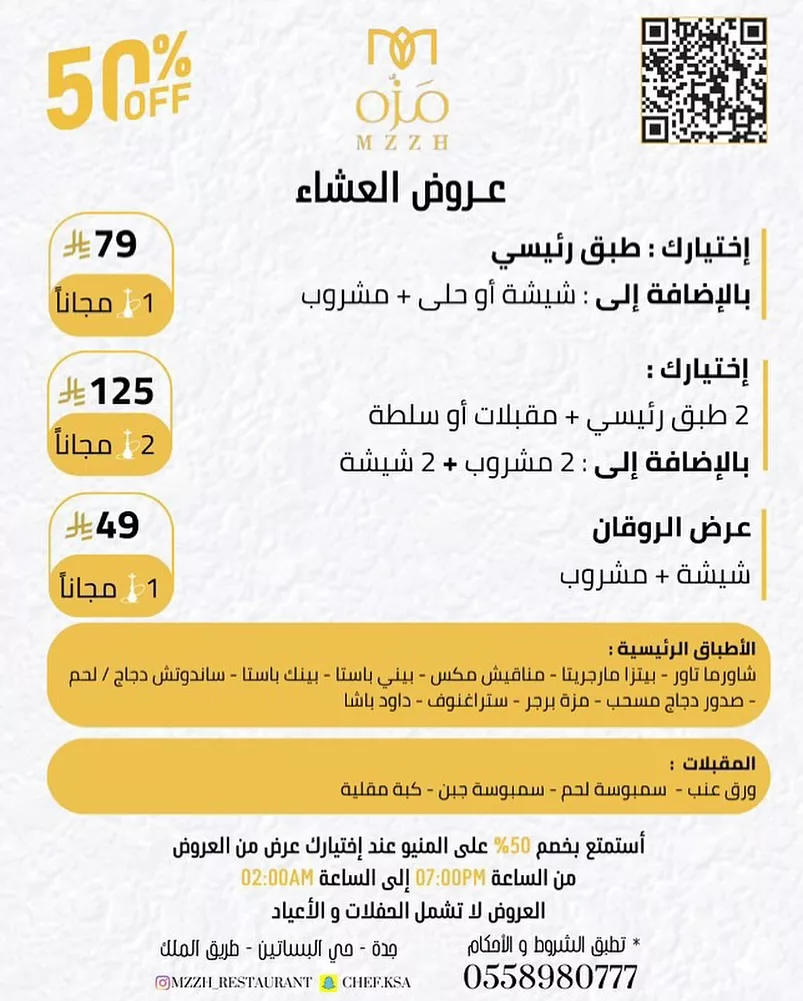 ضمن تغطية عروض المطاعم و الكافيهات في السعودية، نسلط الضوء اليوم على عرض عشاء مميز من كافيه مزه الواقع على طريق الملك في حي البساتين بجدة، والذي يدمج بين الأطباق الشهية والأجواء الراقية بخصم يصل إلى 50%