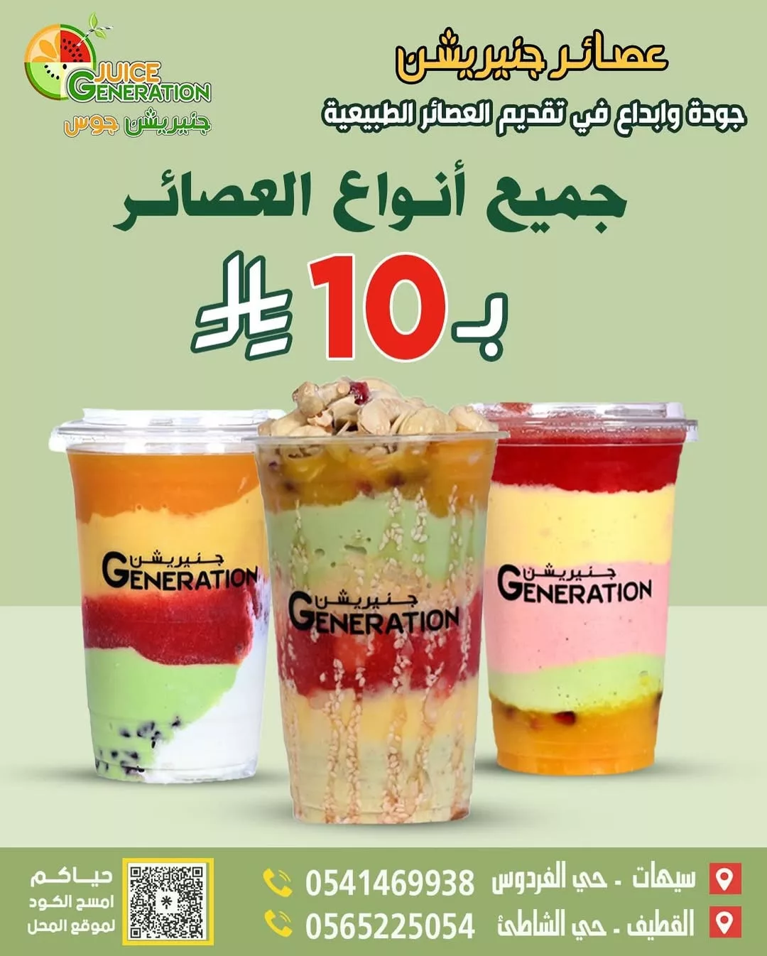 عروض عصائر جنيريشن جميع انواع العصائر ب 10 ريال فقط جودة و ابداع في تقديم العصائر المنعشه ليومي الاربعاء و الخميس 15 و 16 اكتوبر 2025
