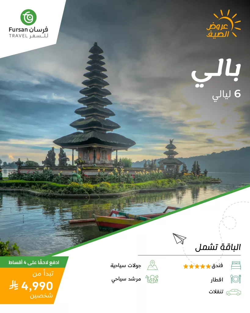 تفاصيل الرحلة: 6 ليالي في بالي والباقه تبدأ سعرها من 4990 ريال والدفع الباقي لاحقا على 4 اقساط.