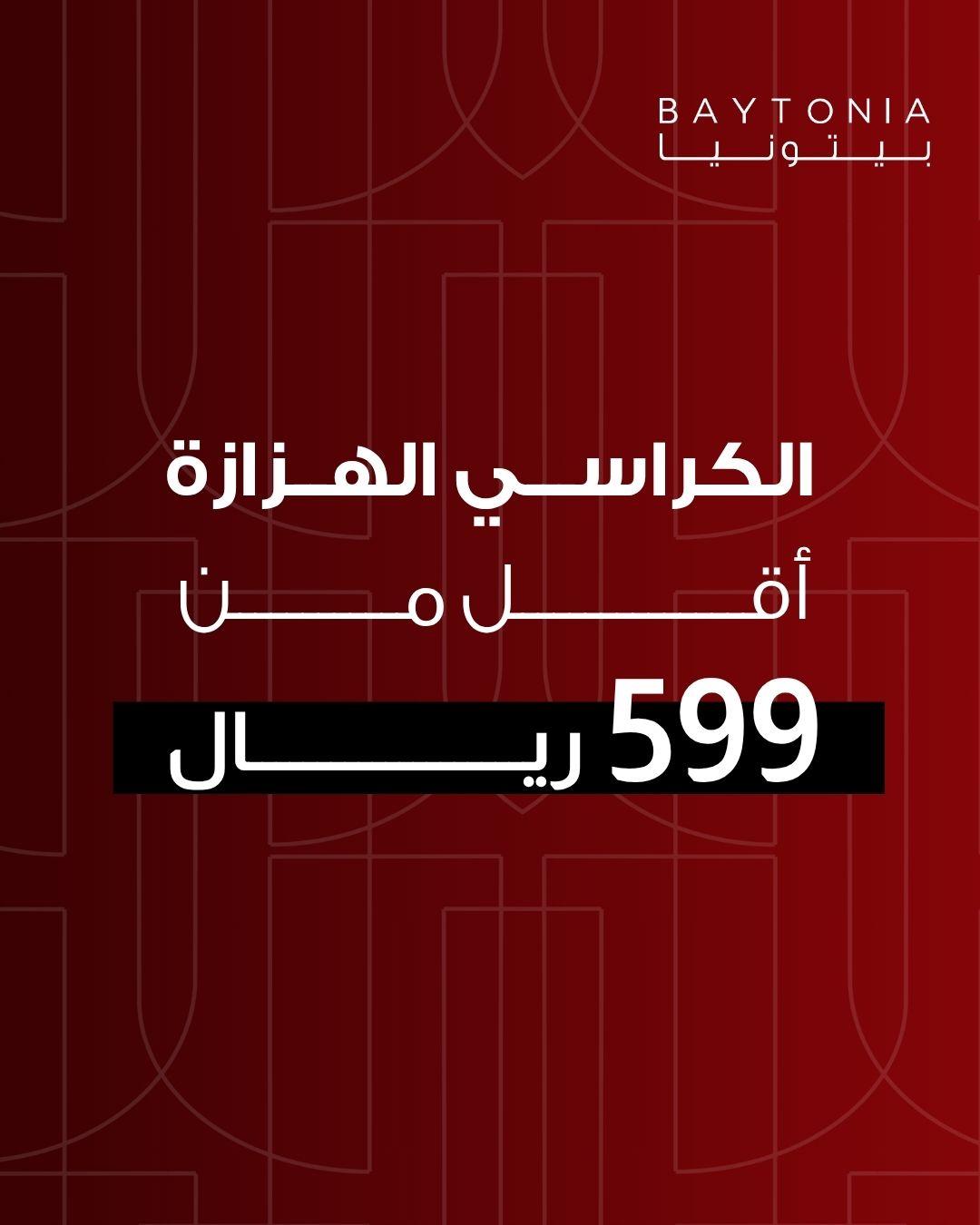 تقدم بيتونيا BAYTONIA عرضا مميزا على الكراسي الهزازة وكراسي الاسترخاء بأسعار تبدأ من 599 ريال فقط خلال شهر أغسطس 2025 هذا العرض يعكس الجودة والأناقة بأسعار مناسبة للجميع لا تفوتوا افضل عروض المفروشات وتابعونا لتجدو التوفير والراحه
