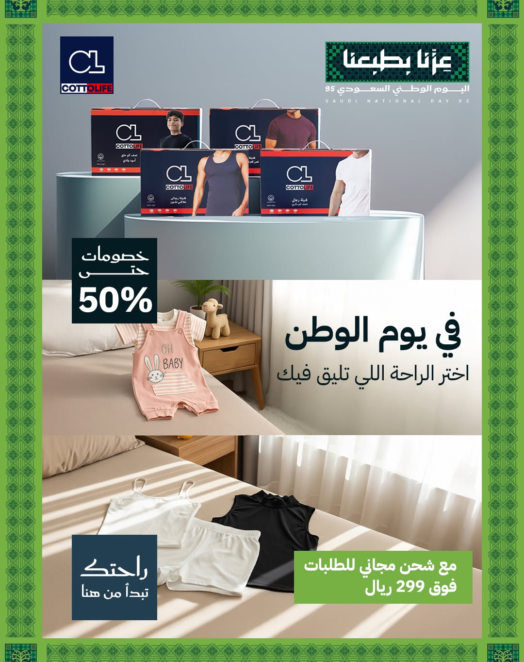 عروض كوتولايف تخفيضات قوية بمناسبة اليوم الوطني السعودي 95، لتتيح للجميع فرصة الاستفادة من منتجات قطنية فاخرة تجمع بين الراحة والجودة العالية. يتميز هذا العرض بتنوعه الكبير ليشمل الملابس الرجالية والنسائية والأطفال، مما يجعله مناسبًا للعائلة بأكملها اختر الراحة اللي تليق فيك بخصم تصل حتى 50%، مع خدمة شحن مجاني للطلبات التي تتجاوز 299 ريال