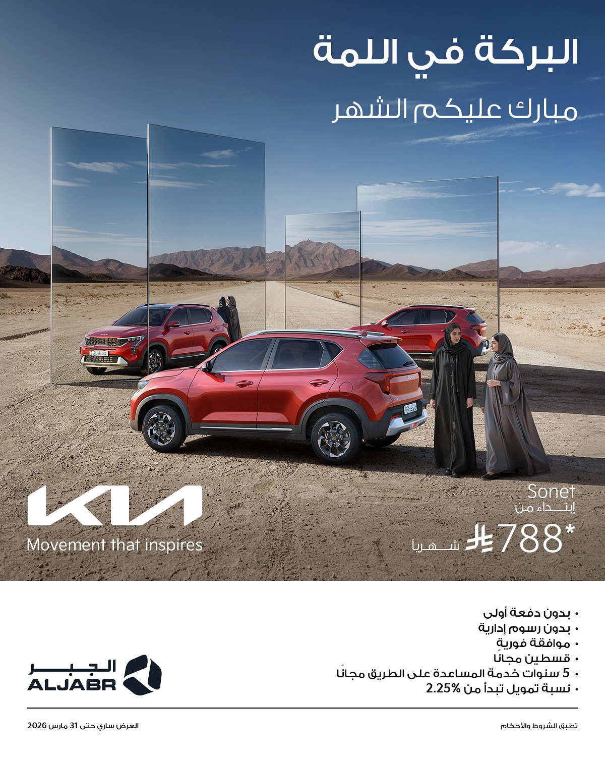 عروض كيا الجبر على سيارة كيا سونيت الخميس 5 فبراير 2026 تخفيضات كبرى في رمضان افضل العروض الحصرية من كيا الجبر و ايضا هذه العروض تسري 31 مارس 2026 فقط استفيدوا من التوفير ضمن تخفيضات رمضان و استمتعوا بقيادة عصري