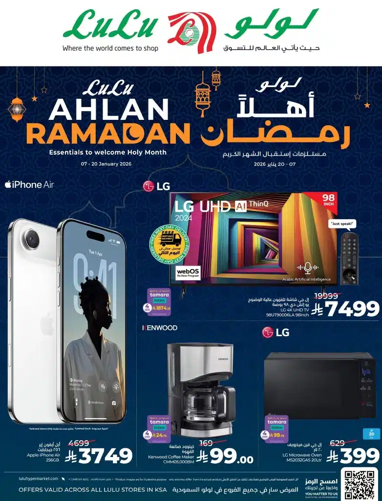 عروض لولو السعودية الاسبوعية الاربعاء 7 يناير 2026 الموافق 18 رجب 1447هـ و تحتوي علي افضل الاجهزة الكهربائية بمناسبة تخفيضات رمضان 1447هـ و تشمل الثلاجات و الغسالات و الخلاطات و اجهزة تحضير الطعام و بتوفر كمان شاشات التلفزيون و الجوالات و باقل الاسعار المناسبة للجميع في جميع فروع لولو السعودية