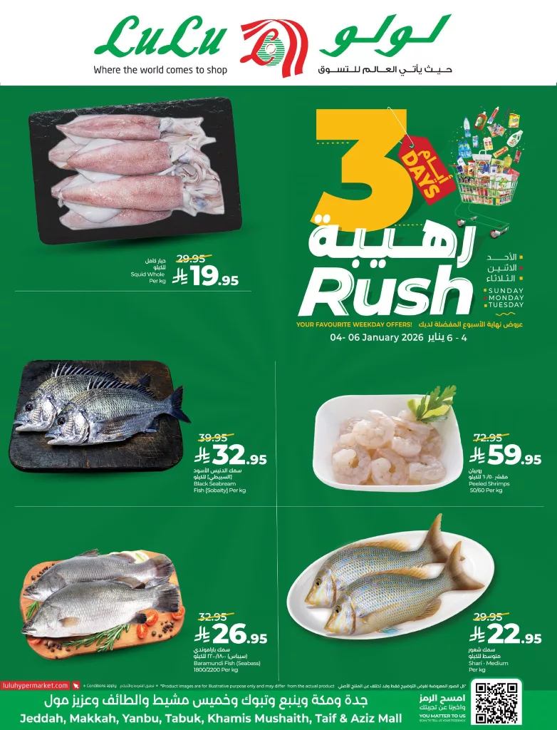 عروض لولو جدة الاحد 4-1-2026 الموافق 15 رجب 1447هـ و تحتوي علي تشكيلة من الخضروات و الفواكه الطازجة منها الطماطم و البطاطس و تشكيلة من الاسماك و غيرها من المنتجات الغذائية و اسعار تنافسية في صفقات حصرية لمدة 3 ايام تابعونا لمعرفة كل جديد عن عروض السعودية علي موقعكم عروض توداي