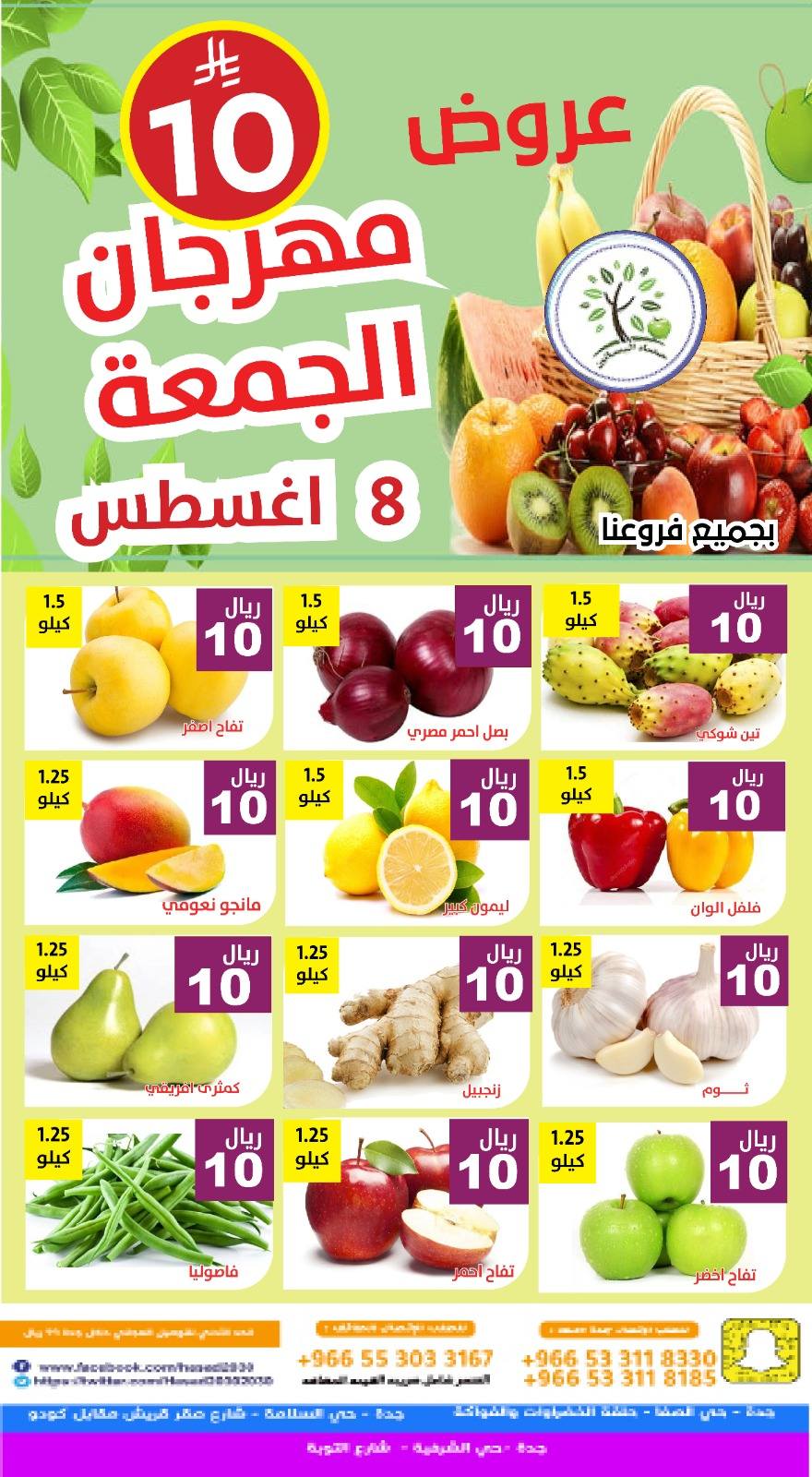 عروض مؤسسة حصاد البساتين الجمعة 8 اغسطس 2025 تقدم تشكيلة واسعة من الفواكه والخضروات الطازجة بين التفاح الأحمر والأخضر والمانجو الناعومي والتين الشوكي والبصل الأحمر والكمثرى والليمون والفلفل الألوان و تشمل الخضار الموسمية مثل الملفوف الأحمر والأخضر والباذنجان بنوعيه الهندي والمدور والكوسة والقرع الأصفر