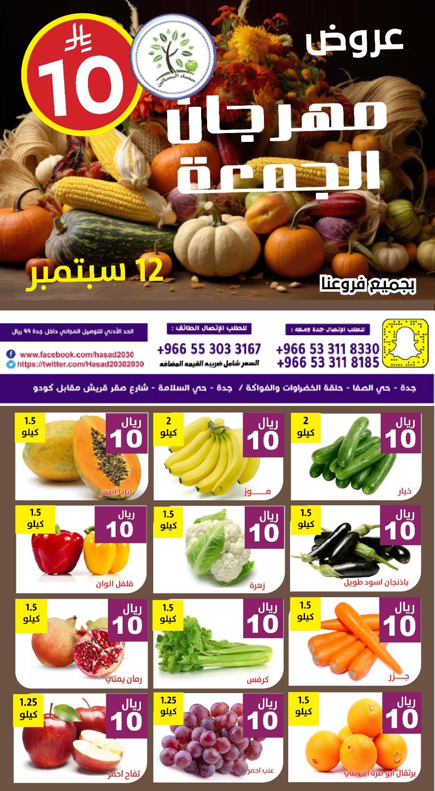 عروض مؤسسة حصاد البساتين الجمعة 12 سبتمبر 2025 تقدم تشكيلة واسعة من أجود أنواع الخضروات الطازجة بين الباذنجان الأبيض الطويل والقرع الأصفر والشمام والملفوف المحشي والبنجر والفلفل الطرشي والبرتقال العصير والقلقاس إضافة إلى مجموعة كبيرة من الفواكه الطازجة مثل التفاح السكري والأصفر والأخضر إلى جانب الأفندي