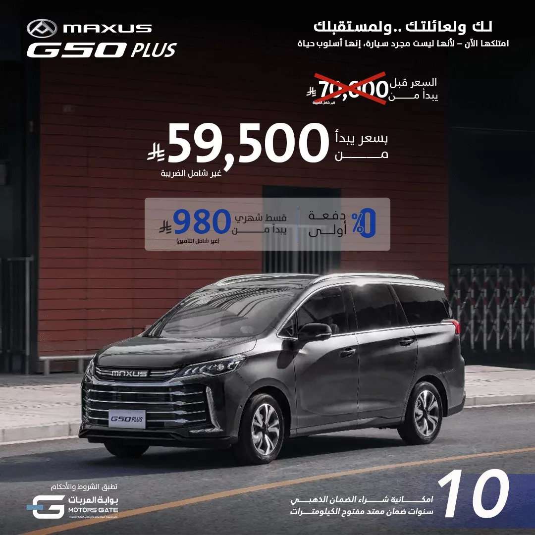 تقدم لكم شركة ماكسيموس السعودية saudimaxus افضل عرض على سيارة G50 plus المميزه و الانيقة ولكن المفاجئة انها بسعر مميز جدا بعد التخفيضات التي حصلت عليها هذه السيارة ضمن العرض حيث انها كانت بسعر يبدأ من 70000 ريال والان بعد العرض اصبحت بسعر يبدأ من 59500 ريال فقط لذلك اغتنموا الفرصه و استفيدوا من العرض.
