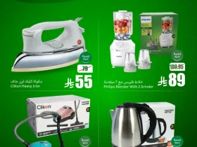 كما توفر العروض خصومات على الأجهزة الكهربائية المنزلية مثل القلايات الهوائية وآلات تحضير الساندويتش ومحضرات العصائر وسخانات الماء الصغيرة بالإضافة إلى مكائن صنع القهوة والمكانس المحمولة ومراوح التهوية العملية ما يجعل هذه الحملة فرصة ذهبية لأهالي جدة للحصول على أفضل المنتجات بأقل التكاليف