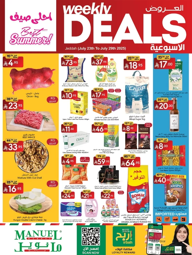 عروض مانويل جدة الأسبوعية الأربعاء 23-7-2025 تقدم عروضًا على تشكيلة متنوعة من المنتجات التي تشمل العصائر الطازجة والمياه المنكهة والفواكه المجففة والبقوليات المعلبة والحبوب المتنوعة مثل الكينوا والبرغل ودقيق الذرة ومنتجات الألبان مثل الجبن الطازج والزبدة المخفوقة والحليب بنكهاته المختلفة