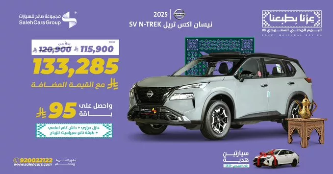 عروض مجموعة صالح للسيارات على نيسان اكس تريل SV N-TREK 2025 مع باقة اليوم الوطني المميزة بـ 95 ريال فقط