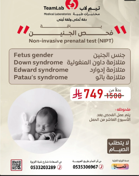 تقدم مختبرات تيم لاب الطبية عروض مميزه لفحص الجنين بطريقة NIPT غير الجراحي و التي سوف تكون بسعر مميز و هو 749 ريال فقط بدلا من 1500 ريال وتكشف عن جنس الجنين و متلازمه داون المنغوليه و ومتلازمه ادوارد و ومتلازمه باتو لا تفوتوا العرض.