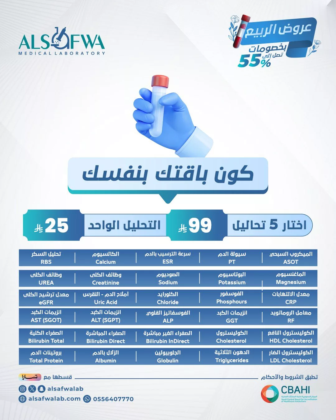 كون باقتك بنفسك مع مختبر الصفوة الطبية ضمن عروض الربيع التي توفر خصماً يصل إلى 55٪ حيث يمكنك الاستفادة من العرض المميز التالي: