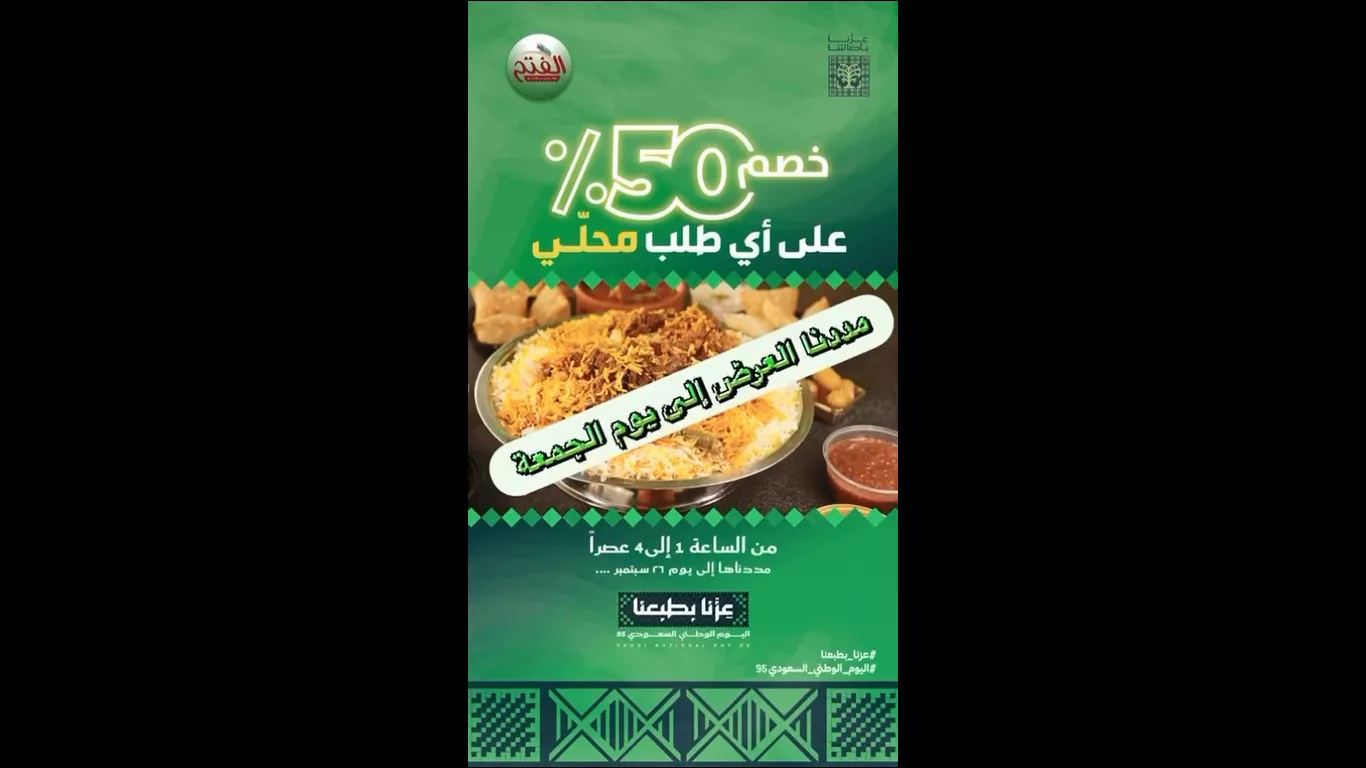 عروض مطاعم ومطابخ الفتح خصم 50% بمناسبة اليوم الوطني السعودي 2025 وهذا الخصم ضمن الفروع