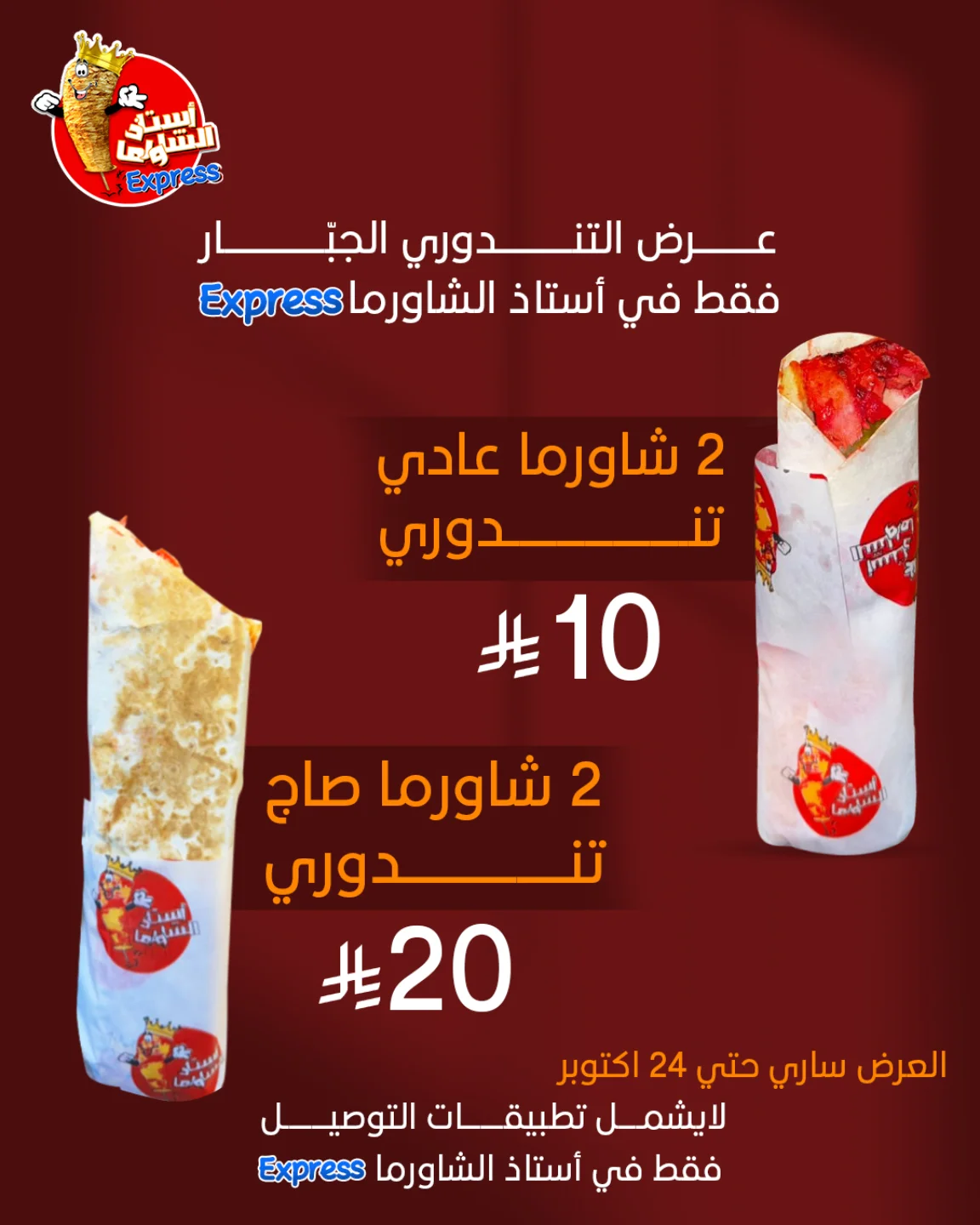 - عرض التندوري الجبار وصل 2 شاورما عادي بـ10 ريال أو خذ 2 شاورما صاج بـ20 ريال