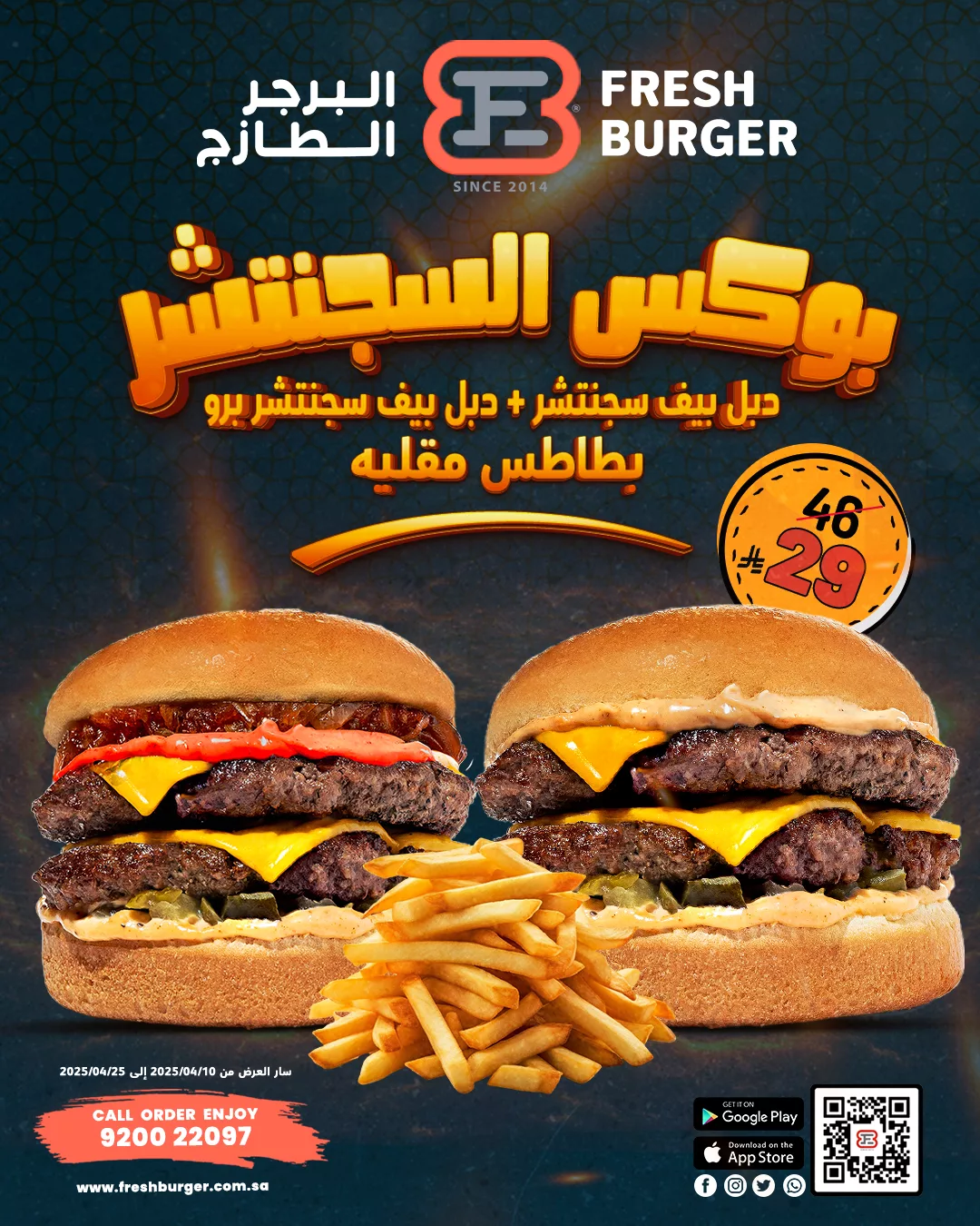 ومع تغطية موقع عروض توداي لكافة العروض المميزة في المملكة فإن عرض بوكس السجنتشر من البرجر الطازج يعتبر من أبرز العروض الحالية التي تستحق التجربة سواء كنت من سكان الرياض أو تزور أحد فروع البرجر الطازج المنتشرة في السعودية،