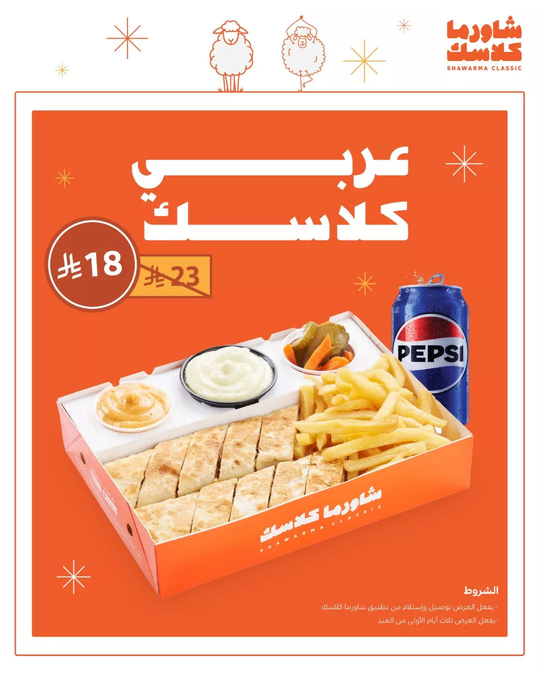 عروض مطعم شاورما كلاسك تأتي هذا العيد بنكهات شرقية أصيلة ومذاق لا يُقاوم حيث تقدم وجبة العربي كلاسيك بتقديم أنيق يجمع بين الساندوتشات المقطعة والبطاطس المقرمشة مع تشكيلة من الصوصات المميزة والمخللات وكل ذلك يُقدَّم بطريقة مغرية تلائم الأجواء الاحتفالية وترضي جميع الأذواق