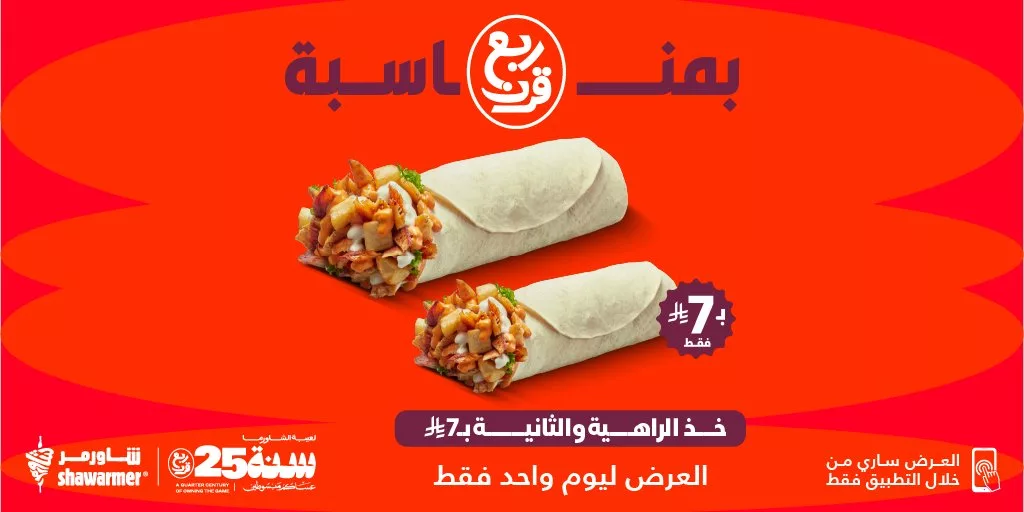 عروض مطعم شاورمر اشتري الراهية وخذ الثانية ب7 ريال فقط العرض ساري ليوم واحد فقط 12 اكتوبر 2025 فقط