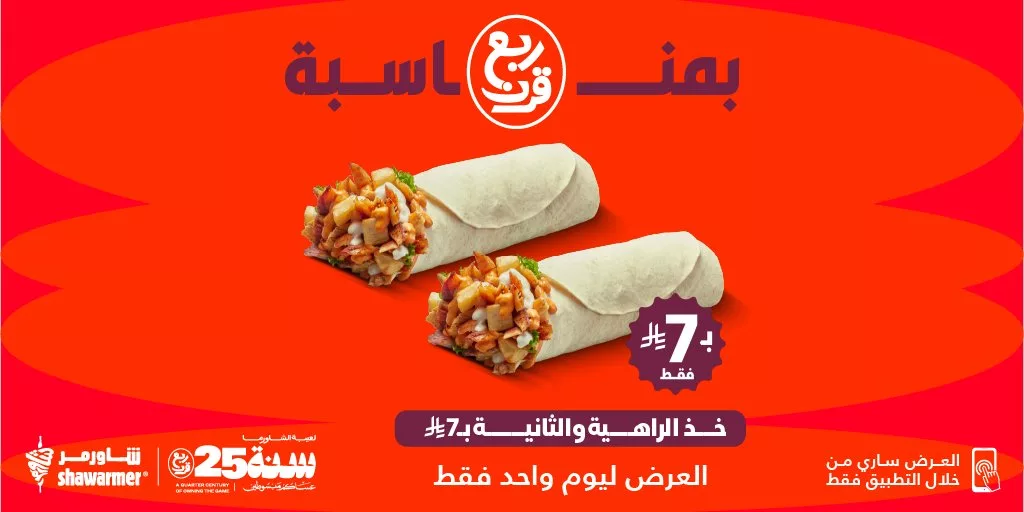 عروض مطعم شاورمر خذ الراهية والثانية بـ7 ريال فقط 26 اكتوبر 2026 بمناسبة مرور ربع قرن على تأسيس مطاعم شاورمر في السعودية نحتفل معكم بعرض لا يقاوم