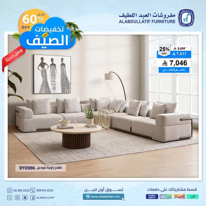 عروض مفروشات العبد اللطيف والتي تقدم تخفيضات مذهلة تصل إلى 60% بالإضافة إلى خصومات إضافية لفترة محدودة على تشكيلات متنوعة من الأثاث المنزلي والمكتبي والسجاد والموكيت