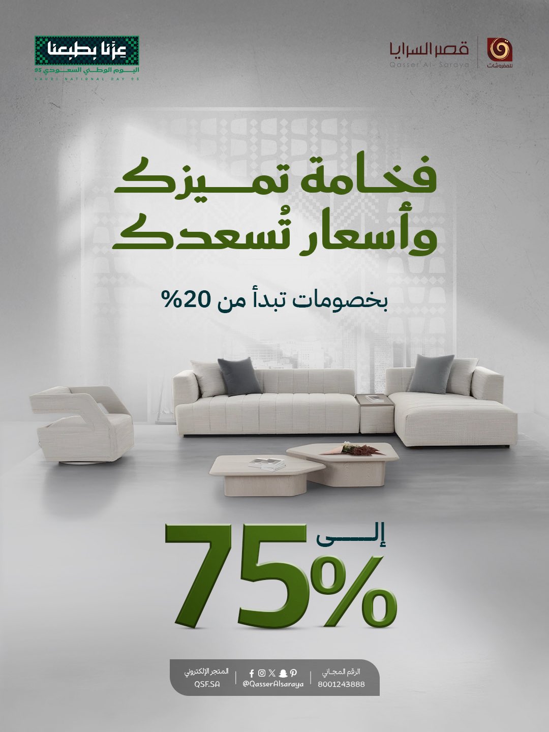تقدم مفروشات قصر السرايا عرض خاص على أحدث تشكيلاتها من الكنب المودرن والنيو كلاسيك بجودة عالية تعكس الفخامة وتلبي مختلف الأذواق عرض قصر السرايا هذا العام في الفترة المخصصة للاحتفال باليوم الوطني السعودي، ليمنح العملاء خصومات هائلة تبدأ من 20% وتصل حتى 75%