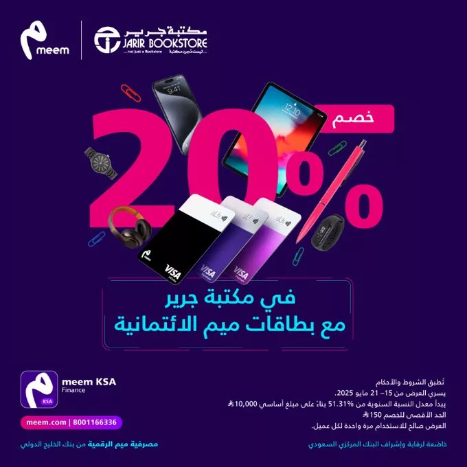 يمكنك الآن الاستمتاع بخصم مباشر بنسبة 20% عند استخدام بطاقات ميم الائتمانية أثناء التسوق في مكتبة جرير. يشمل العرض مجموعة واسعة من المنتجات المعروضة، مثل: