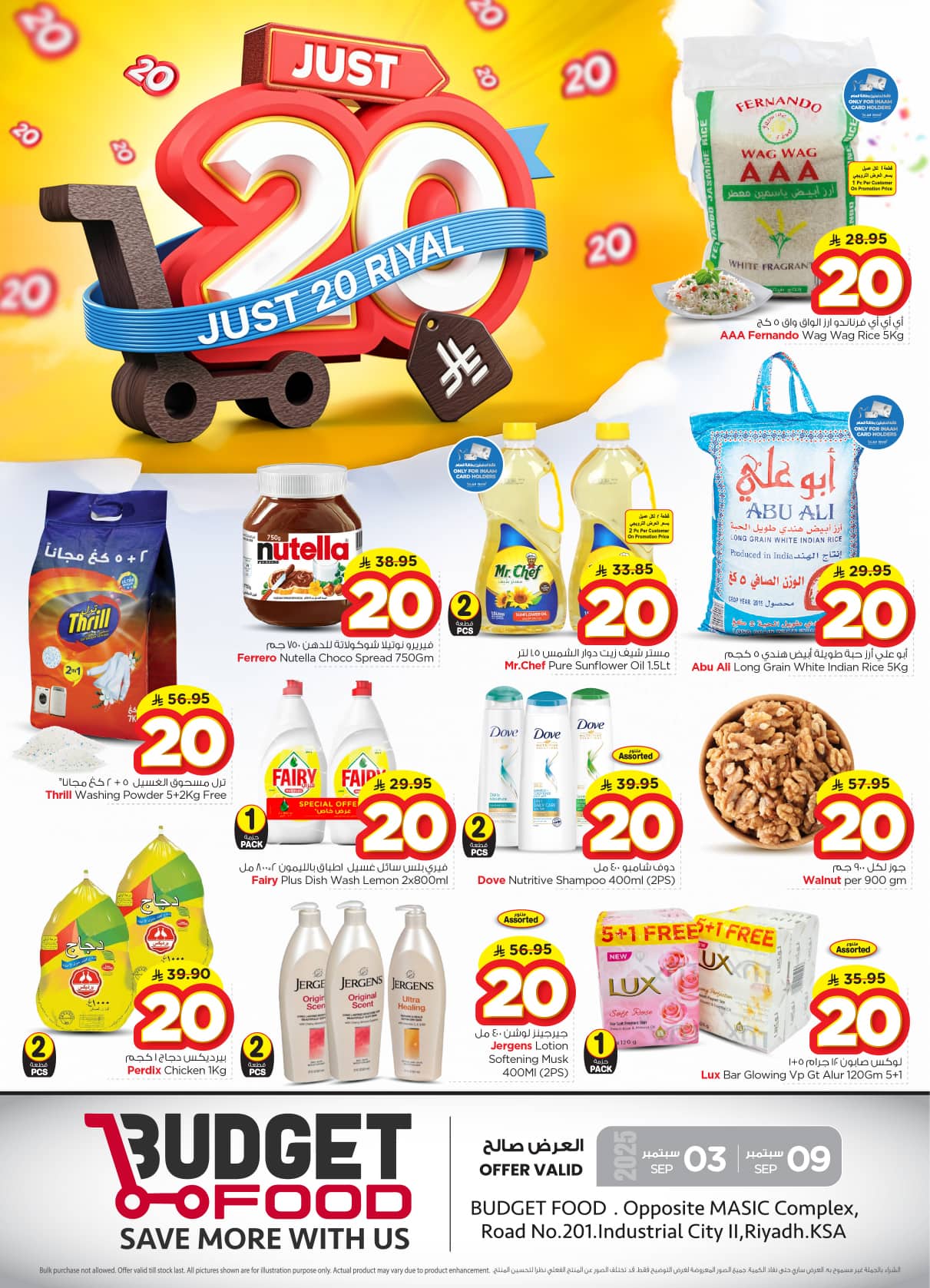 عروض ميزانية الطعام الأسبوعية الأربعاء 10 ربيع الأول 1447هـ تقدم منتجات غذائية أساسية تشمل الأرز الطويل الحبة و العدس الأصفر و الفاصوليا الحمراء و الحمص المجفف و البرغل و الشعير بالإضافة إلى الأجهزة المنزلية التي تضم أجهزة طحن التوابل و أفران الطهي الهوائية و أجهزة تحضير القهوة العربية و أجهزة تسخين الطعام
