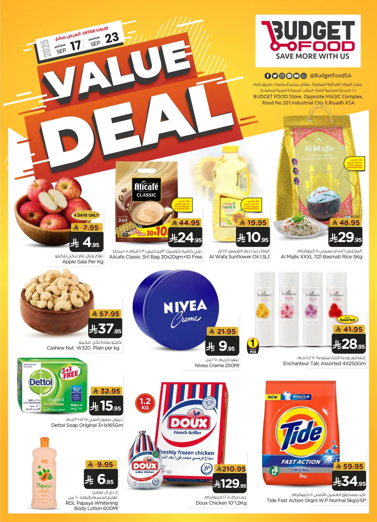عروض ميزانية الطعام الأسبوعية الأربعاء 25 ربيع الأول 1447هـ تقدم تخفيضات على البقوليات المعلبة مثل الفاصوليا والذرة الحلوة والفول المدمس بجانب منتجات المخبوزات الطازجة والخضروات مثل البطاطس والكوسة والفلفل الأخضر والفواكه كما تضم أجهزة الميكروويف وأجهزة تحضير العصائر والتوسترات وسخانات المياه وأجهزة تبريد