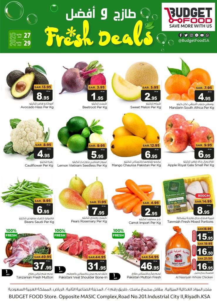 عروض ميزانية الطعام الاحد 27 يوليو 2025 تقدم تشكيلة طازجة من الخضار والفواكه الموسمية من الأفوكادو والمانجو والتفاح إلى الشمام والبنجر واليوسفي و تشمل أيضا اللحوم والدواجن الطازجة بالإضافة إلى أساسيات المطبخ مثل الأرز والزيت والحليب مع منتجات تنظيف وعناية شخصية باقل الاسعار التي تناسب الجميع