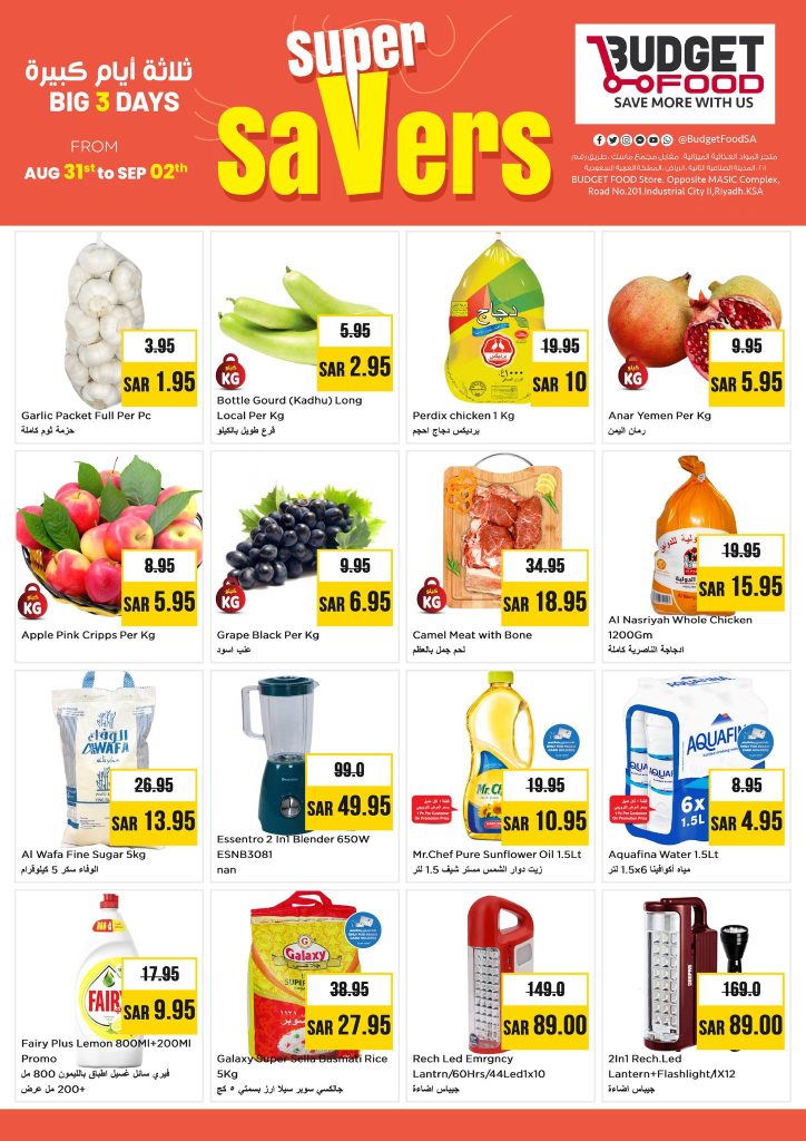 عروض ميزانية الطعام الأحد 31 أغسطس 2025 تقدم تشكيلة متنوعة من الخضروات والفواكه الطازجة مثل الثوم المحلي والقرع والرمان والتفاح والعنب الأسود و تمتد لتشمل السلع التموينية مثل السكر والأرز وزيت دوار الشمس بالإضافة إلى العروض على المنظفات والمياه المعبأة وتخفيضات على الأجهزة المنزلية