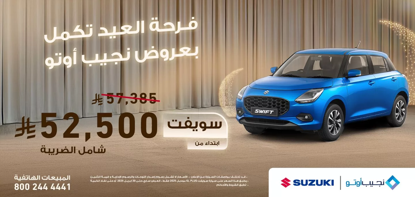 عروض نجيب أوتو في عيد الفطر لهذا العام تقدم فرصة مميزة لعشاق السيارات الجديدة حيث توفر الشركة خصومات مغرية على مجموعة مختارة من موديلات سوزوكي المشهورة بأسعار شاملة للضريبة مع الحفاظ على جودة الأداء والمواصفات الرائعة و تستمر هذه العروض حتي الاربعاء 30-4-2025 تابعونا لمعرفة كل جديد .