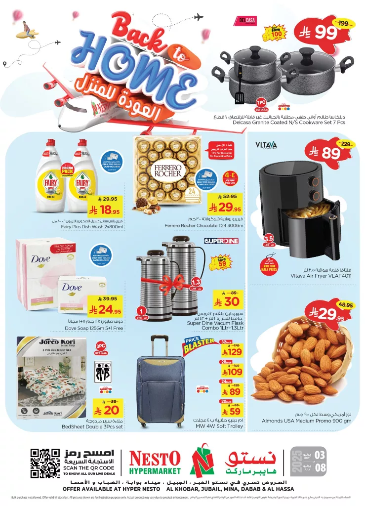 عروض نستو الدمام تشمل أيضا تخفيضات كبيرة على الأدوات المنزلية وأجهزة المطبخ مثل طقم قدور جرانيت وقلاية هوائية أنيقة إضافة إلى تشكيلة مميزة من الفراش والمفارش مثل أطقم ملايات السرير كما تتوفر منتجات العناية الشخصية من أبرز الماركات مثل دوف وكولجيت وإنشنتور وهيمالايا