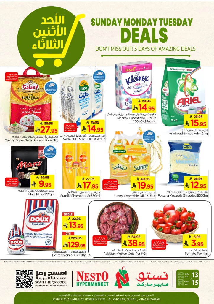 استمتع بتشكيلة رائعة من المنتجات الغذائية والمنزلية في عروض نستو الدمام المذهلة الاحد 13 يوليو 2025 التي تشمل الأرز البسمتي و الحليب طويل الأجل و مناديل الوجه ومسحوق الغسيل أريال بالإضافة إلى تشكيلة من الشامبوهات وزيوت الطبخ والأجبان المجمدة والشوكولاتة والمجمدات والدواجن
