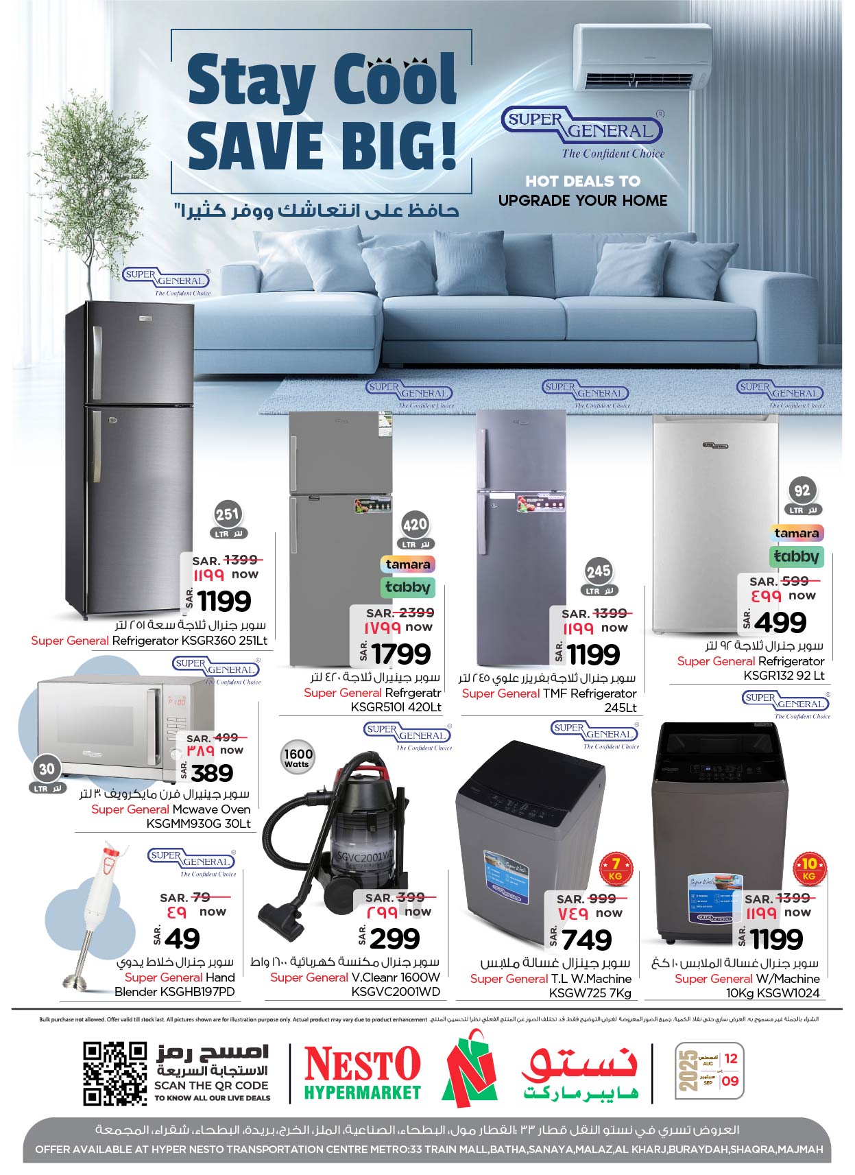 عروض نستو الرياض الجمعة 15 اغسطس 2025 تقدم تشكيلة واسعة من الأجهزة المنزلية من علامة سوبر جنرال مثل الثلاجات و المايكرويفات متعددة الأحجام كما تشمل العروض المكانس الكهربائية والغسالات و تشمل أيضا تشكيلة مميزة من مكيفات السبليت والشباك إضافة إلى أدوات كهربائية صغيرة مثل الخلاطات اليدوية والفرامات
