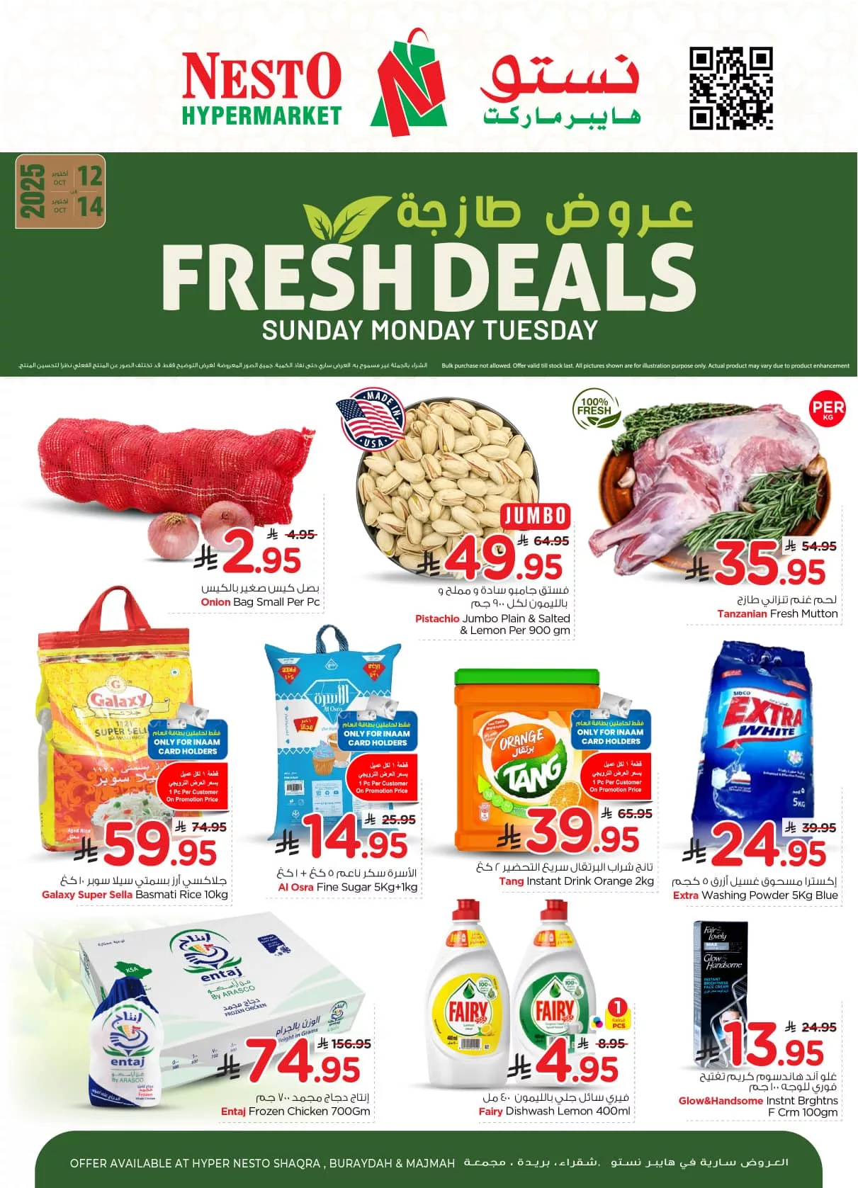 عروض نستو القصيم الاحد 12-10-2025 تتألق بتشكيلة واسعة من المنتجات الطازجة من الخضار والفواكه المتنوعة حيث تتوفر أفوكادو هاس ورمان مصري وبطيخ وخيار وأنواع التفاح والبرتقال بجودة عالية كما يشمل العرض منتجات مثل البطاطا الحلوة والباذنجان والليمون والثوم وتشمل أيضا اللحوم الطازجة مثل لحم عجل باكستاني بالعظم