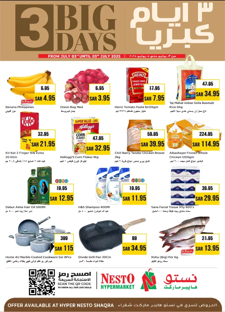 عروض نستو القصيم تشمل تشكيلة مميزة من المنتجات الغذائية الأساسية والخضار والفواكه الطازجة مثل الأرز والبصل والطماطم والموز إلى جانب منتجات الإفطار كالكورن فليكس والشوكولاتة ومجموعة من الدجاج المجمد واللحوم كما تتوفر مستلزمات العناية الشخصية والمناديل المنزلية