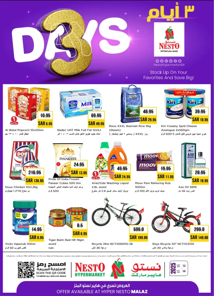 عروض نستو الملز تمتد لتشمل المواد الغذائية ومنتجات العناية اليومية حيث تجد حليب نادك طويل الأجل وأرز بسمتي فاخر وجبن كريمي قابل للدهن إضافة إلى دجاج مجمد مكعبات بانير وسوائل غسيل متنوعة كما تشمل العروض كريمات مسكنة وزيوت علاجية وأيضًا دراجات هوائية للأطفال والكبار