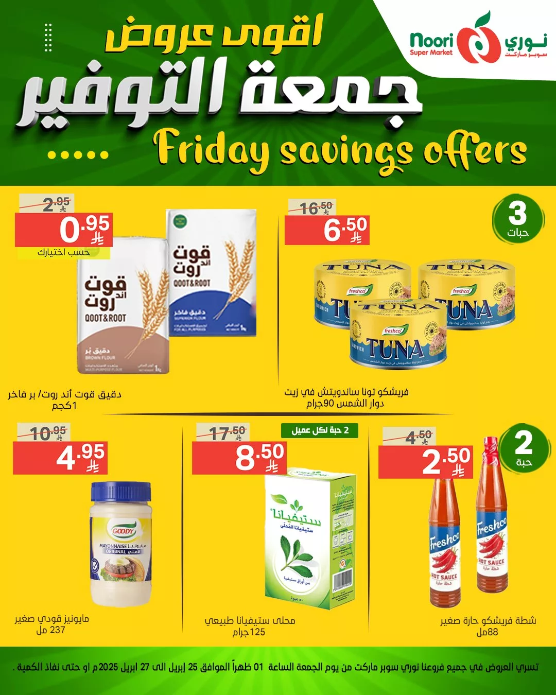 عروض نوري هايبر ماركت الجمعة 25 أبريل 2025 تقدم تشكيلة واسعة من المنتجات الغذائية الأساسية والمعلبة التي تهم كل منزل تشمل الدقيق والتونة والمايونيز والمحليات الصحية إضافة إلى صلصات الطهي مما يجعلها فرصة مثالية لتجديد مخزونك المنزلي بتوفير كبير وتنوع يلبي مختلف الأذواق كما تضم العروض زيت الزيتون وورق العنب والطحينة
