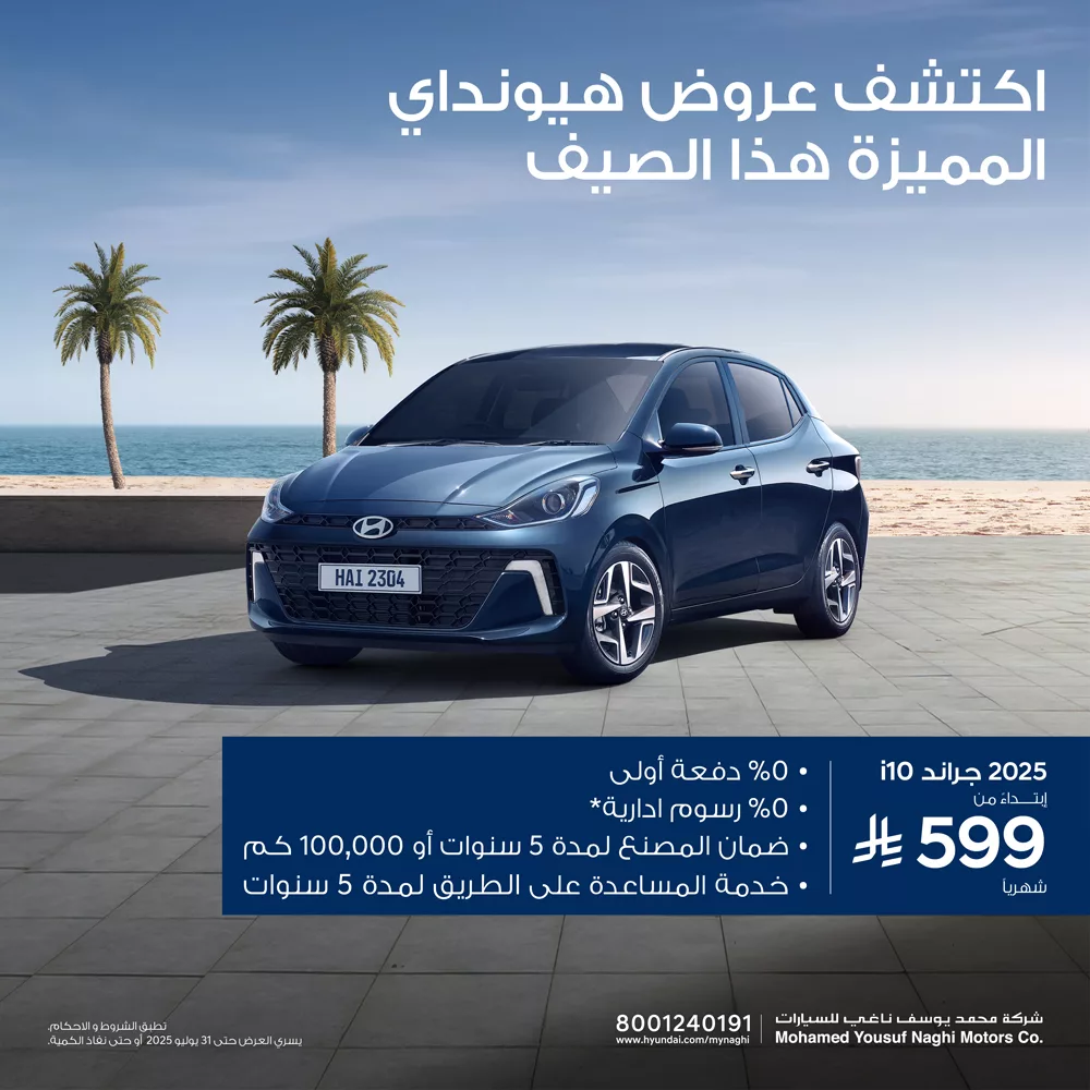 عرض الصيف من هيونداي على سيارة جراند i10 موديل 2025 يقدم لك الراحة والأداء مع مزايا تمويلية مذهلة