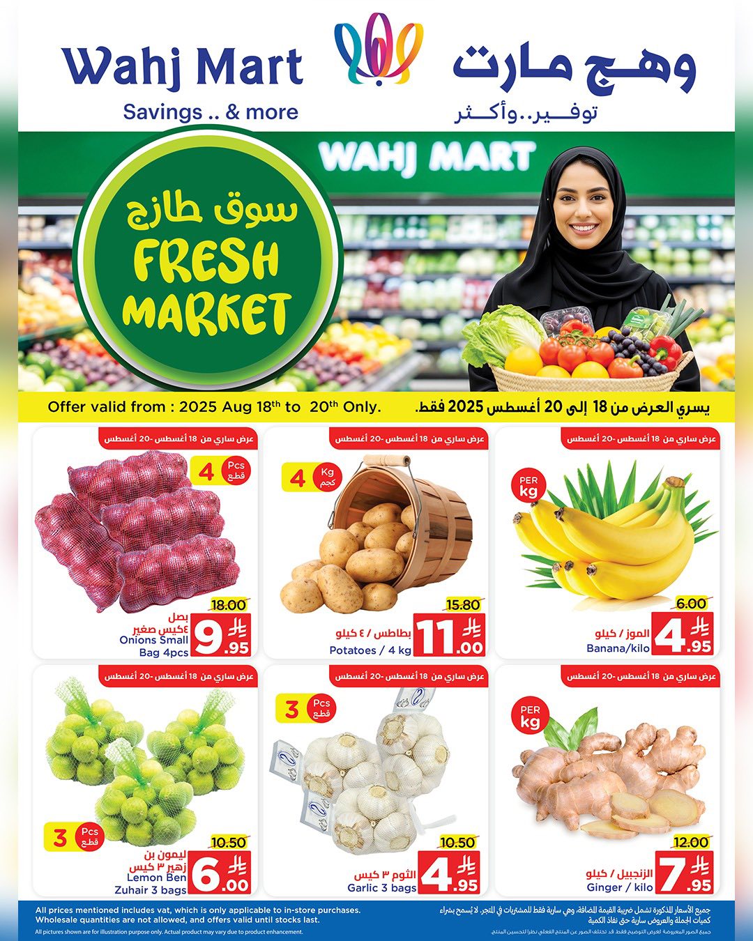 عروض وهج مارت الاثنين 18/8/2025 حيث تجد البصل والبطاطس والموز والليمون والثوم والزنجبيل بجودة عالية وطزاجة يومية لتلبية كل احتياجات المطبخ بمنتجات طبيعية وصحية و تضم لحوم العجل بالعظم وأوصال الغنم والمفروم الطازج وموزات الغنم بقطع مختارة بعناية تناسب كل وصفاتك اليومية
