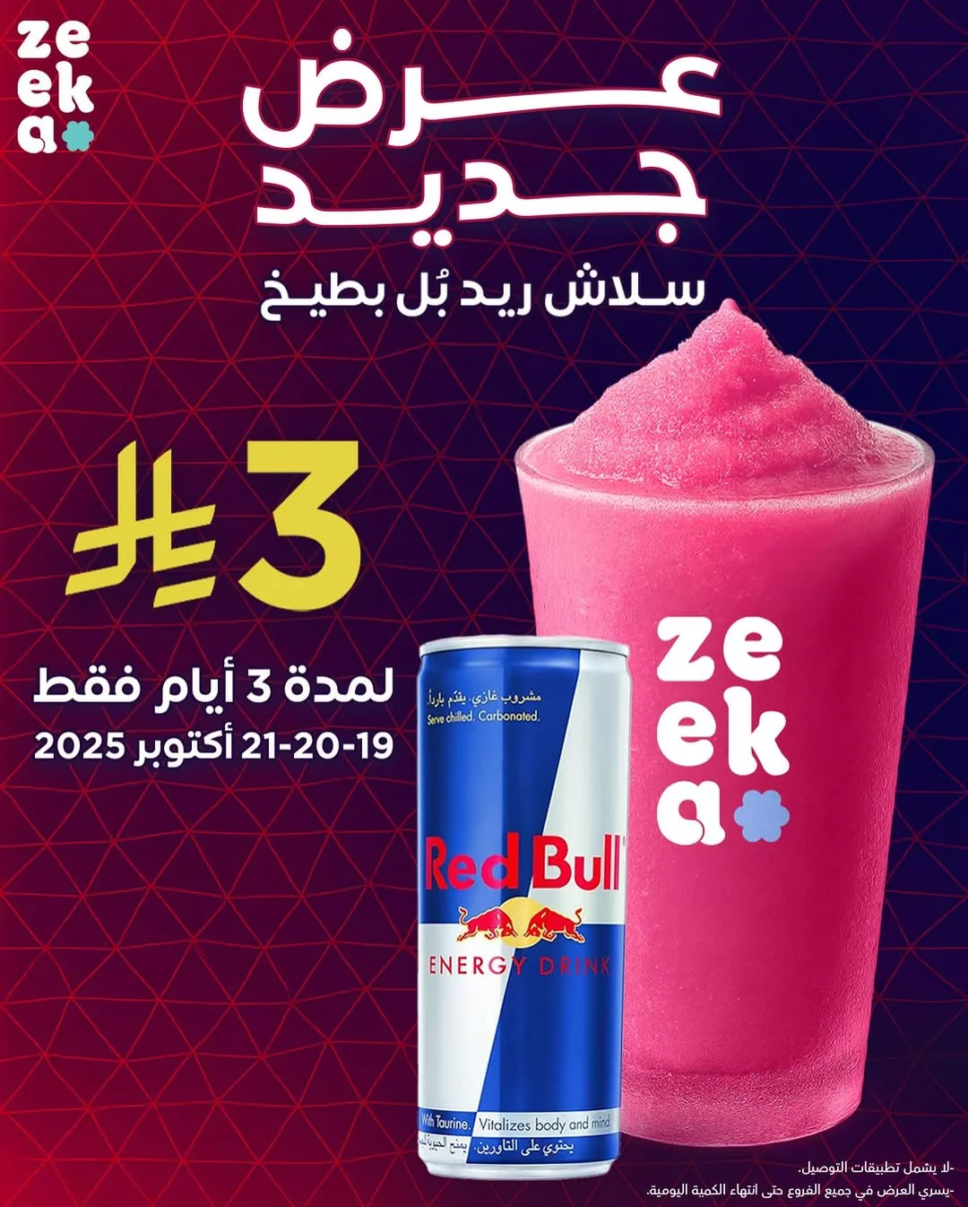 عوض زيكا كافيه على سلاش ريد بول بطيخ بسعر 3 ريال فقط العرض ساري لمدة 3 ايام فقط من 19 حتى 21 اكتوبر 2025 لا تفوتوا النشاط و الانتعاش