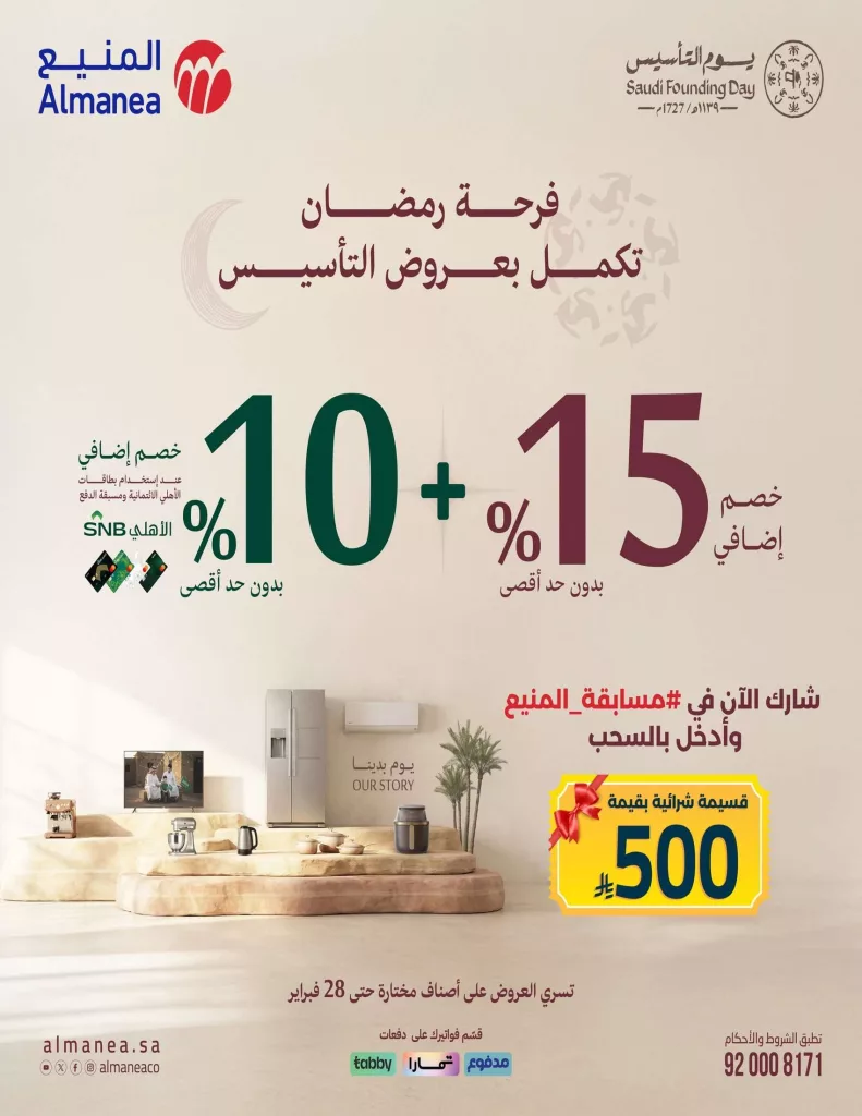 عروض المنيع مستمرة حتي السبت 28-2-2026 الموافق 11 رمضان 1447 و تحتوي علي تشكيلة واسعة من الأجهزة المنزلية بمناسبة يوم التأسيس وقرب رمضان تضم ثلاجات ونشافات ملابس وشاشات ذكية كبيرة